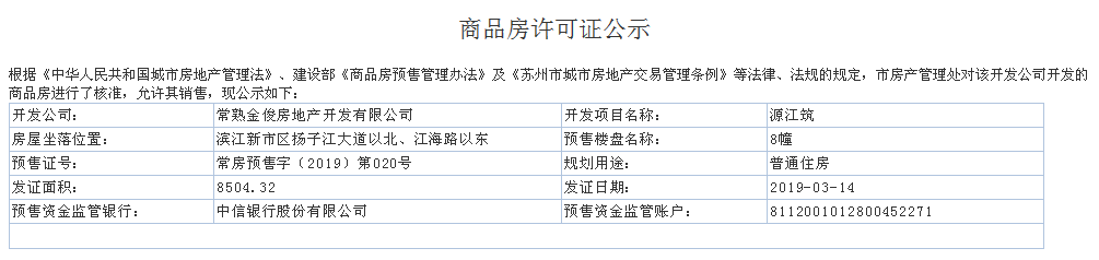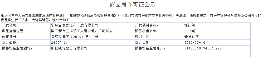金科源江筑二期获得预售,预售许可证号为:常房预售字(2019)第019、020号。
